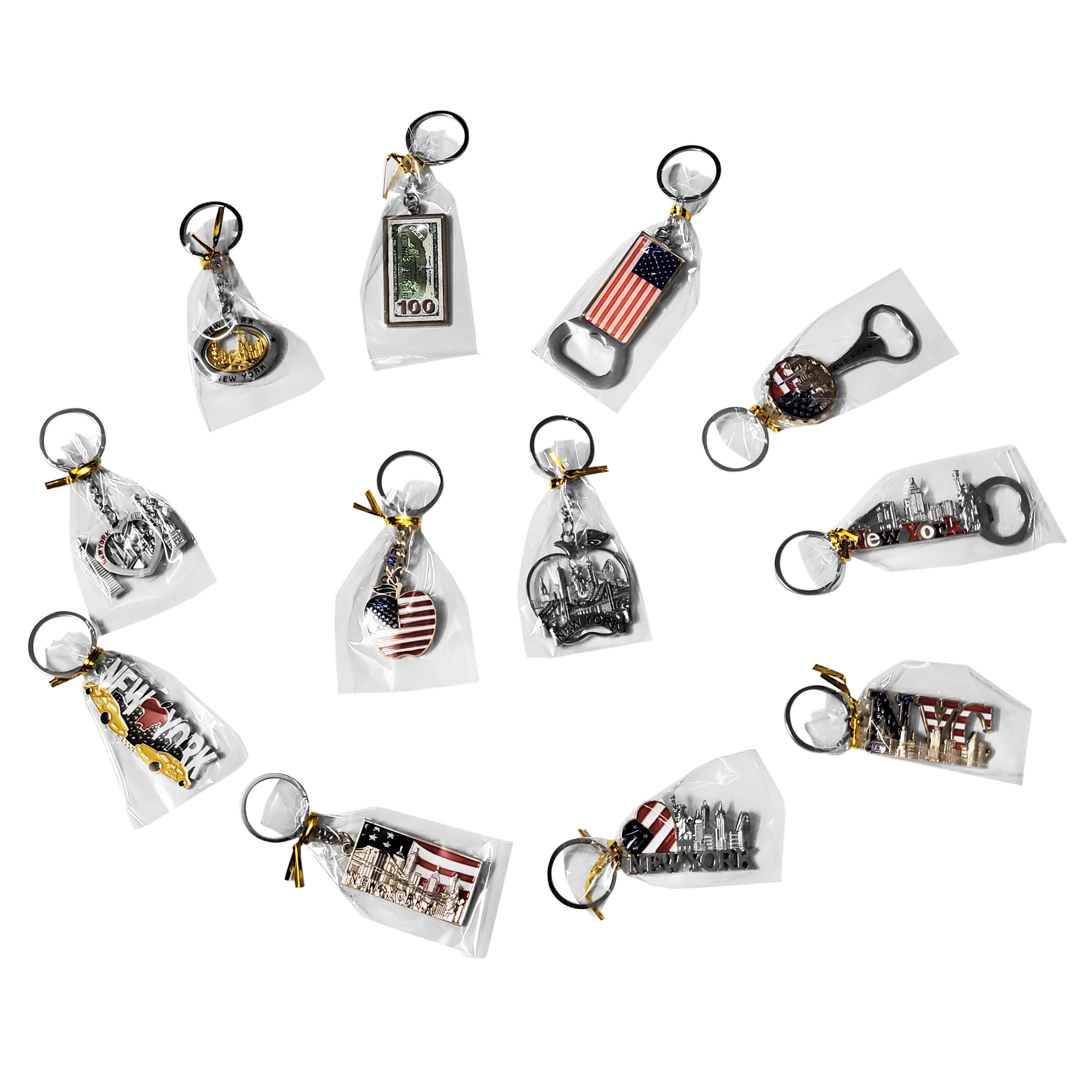 12 Pack Silver NYC Souvenir Collection New York Metal Keychain Ring Bundle Bulk Includes 3pc Bottle Opener, USA Flag, NY Cab, Apple, And More.